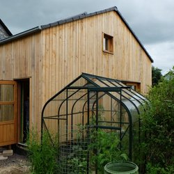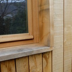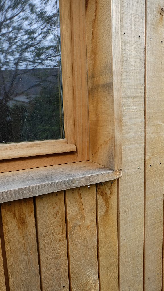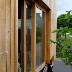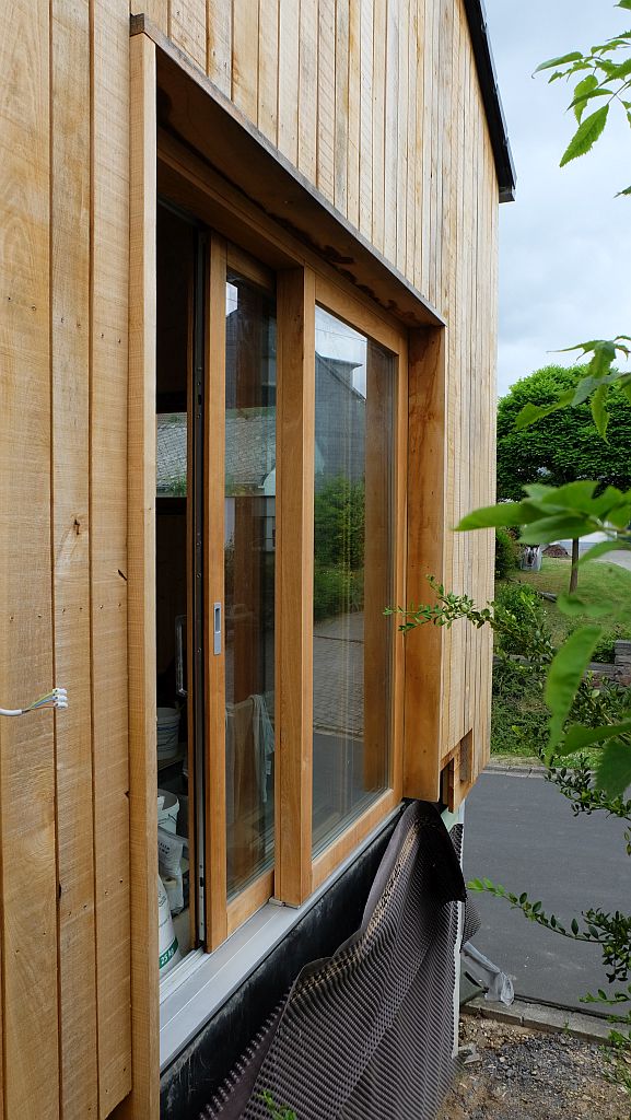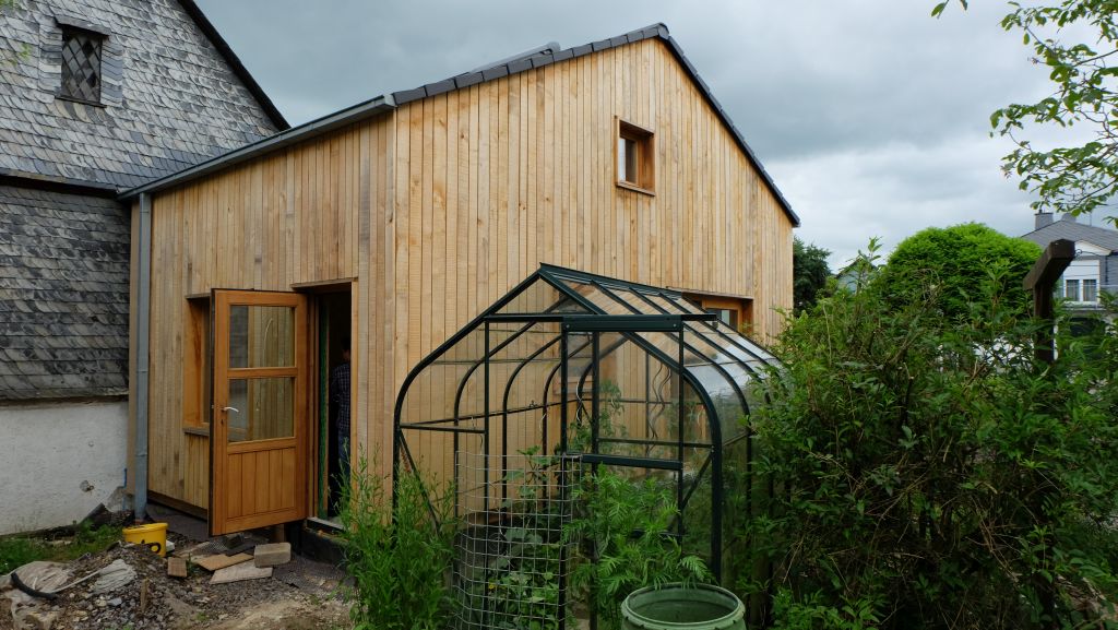 Erweiterung eines sanierten Fachwerkhauses. Holzständerbau kombiniert mit Massivholzelementen. Innen mit Lehmputz außen mit Bretterschalung aus Kastanienholz.