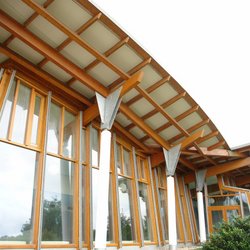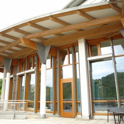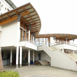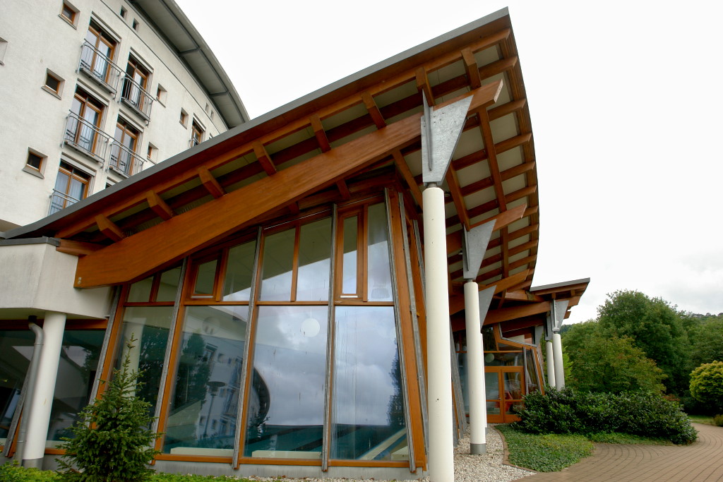 Dem eigentlichen Klinikbau ist ein eingeschossiger Pavillonbau vorgelagert, der eine ausgefallene hölzerne Dachkonstruktion aufweist.