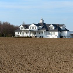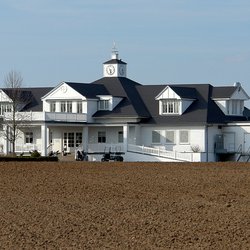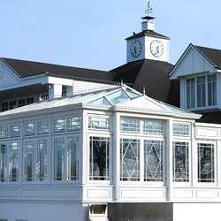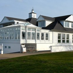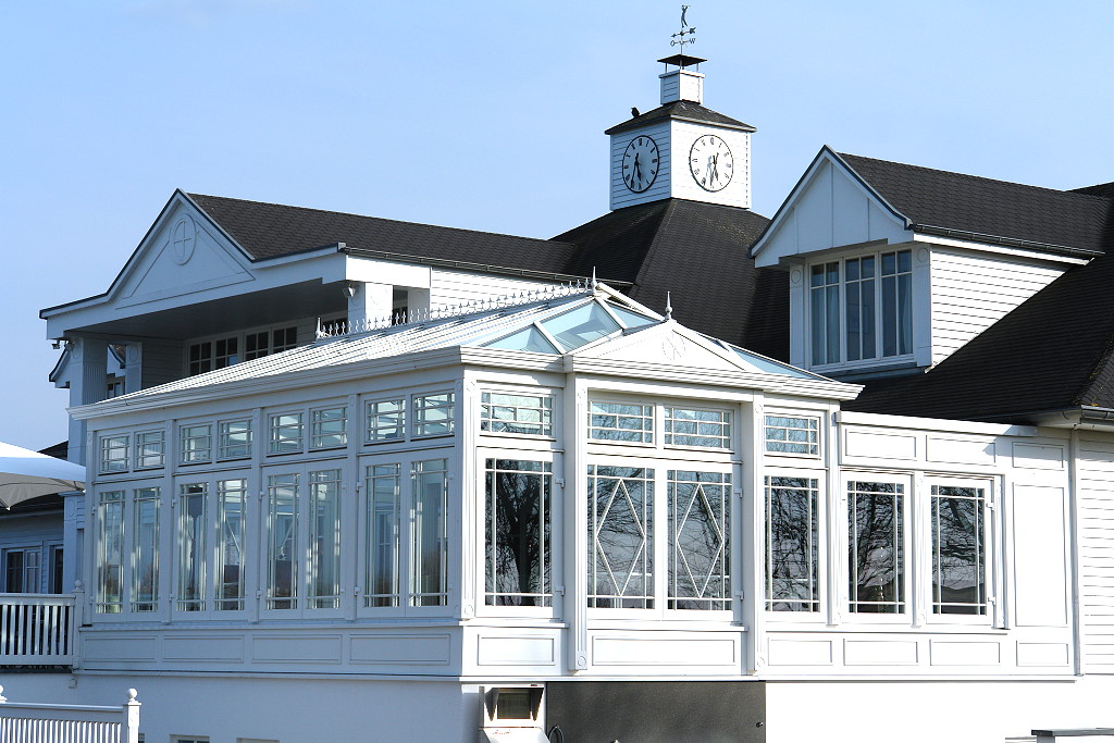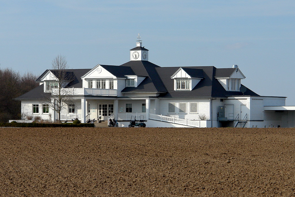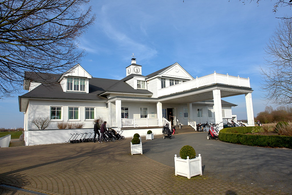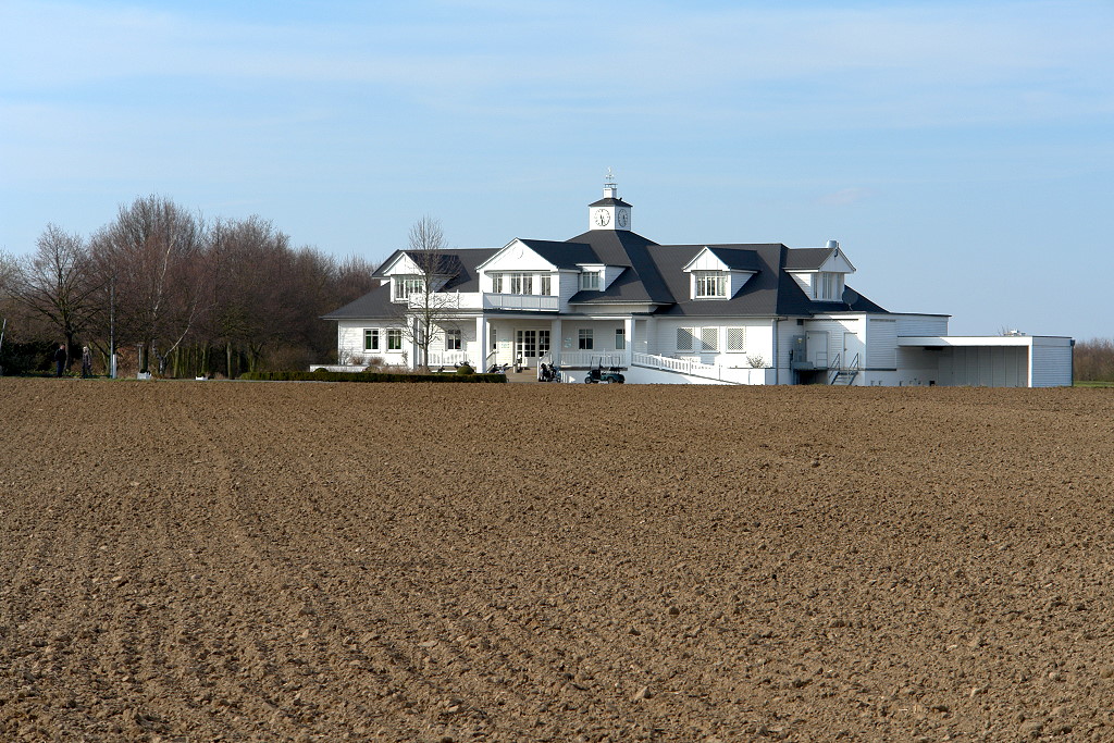 Das Clubhaus des rheinschen Golfclubs wurde im amerikanischen Südstaatenstil mit einer Fassade aus Douglasienholz gestaltet.