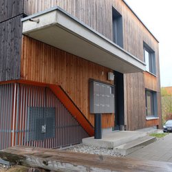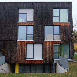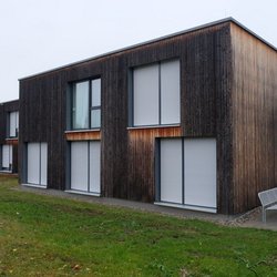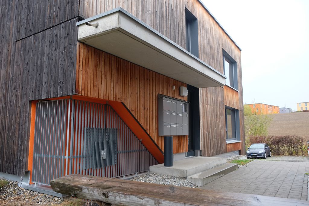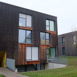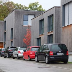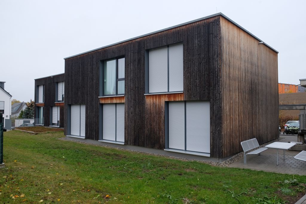 Sieben Häuser mit insgesamt 56 Wohneinheiten - gestaltet als Dorf mit hölzernen Fassaden