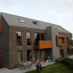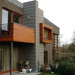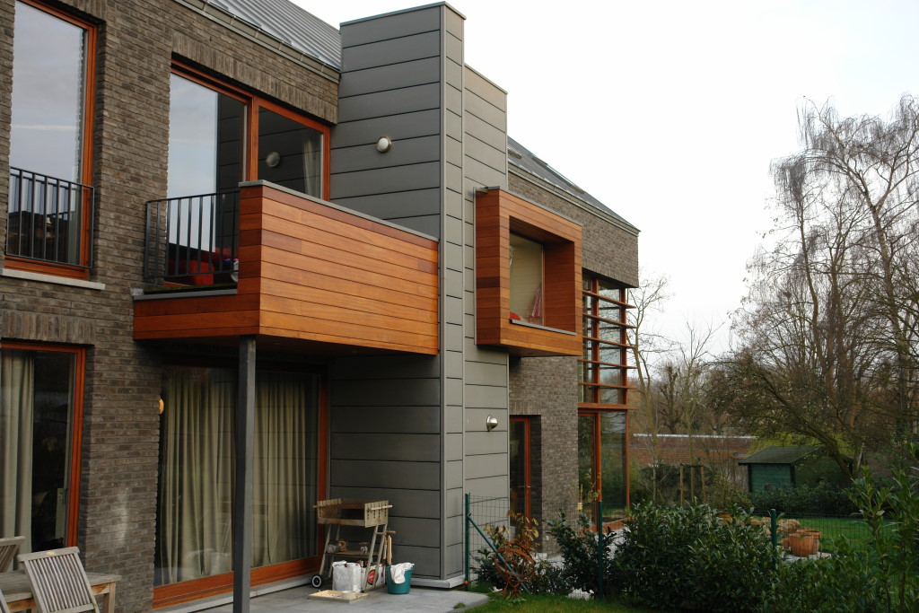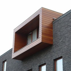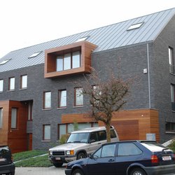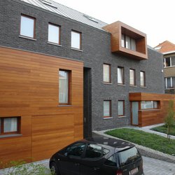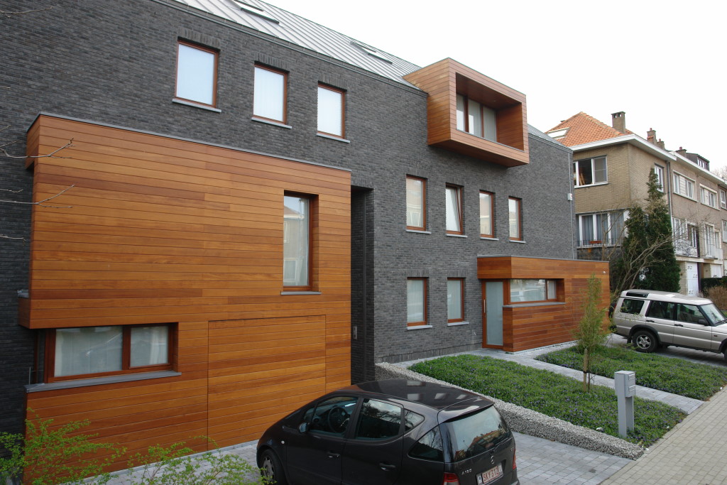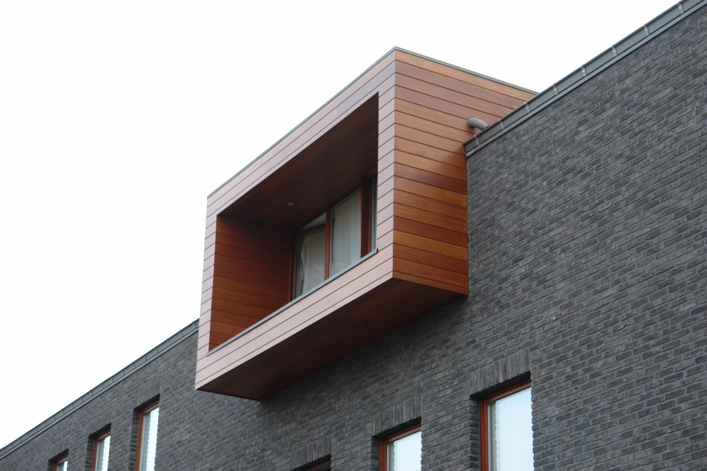 Holz im urbanen Kontext. Eingeschobene Holzboxen setzen einen interessanten Kontrast zu der dunkel geklinkerten Fassade.
