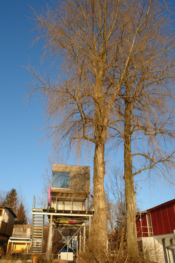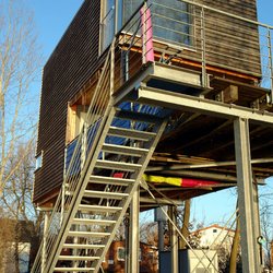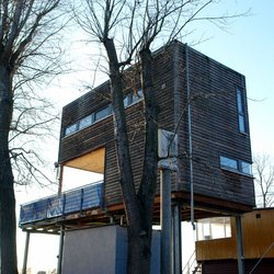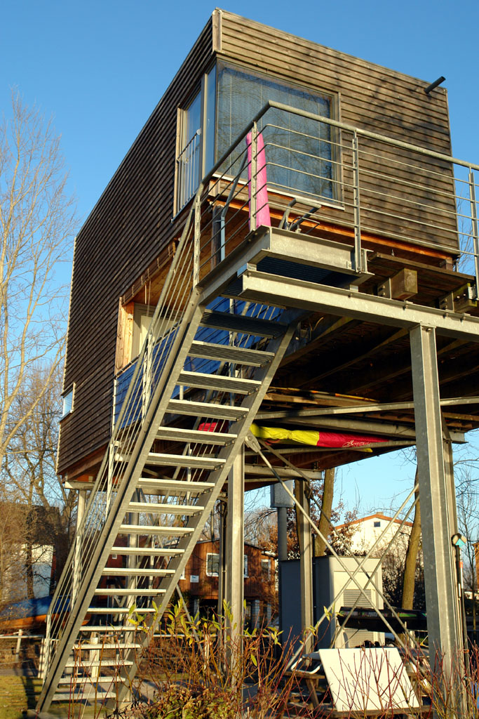 Schlichter Baukörper in Holzrahmenbauweise, auf eine Stahlkonstruktion aufgeständert (Hochwasser).