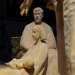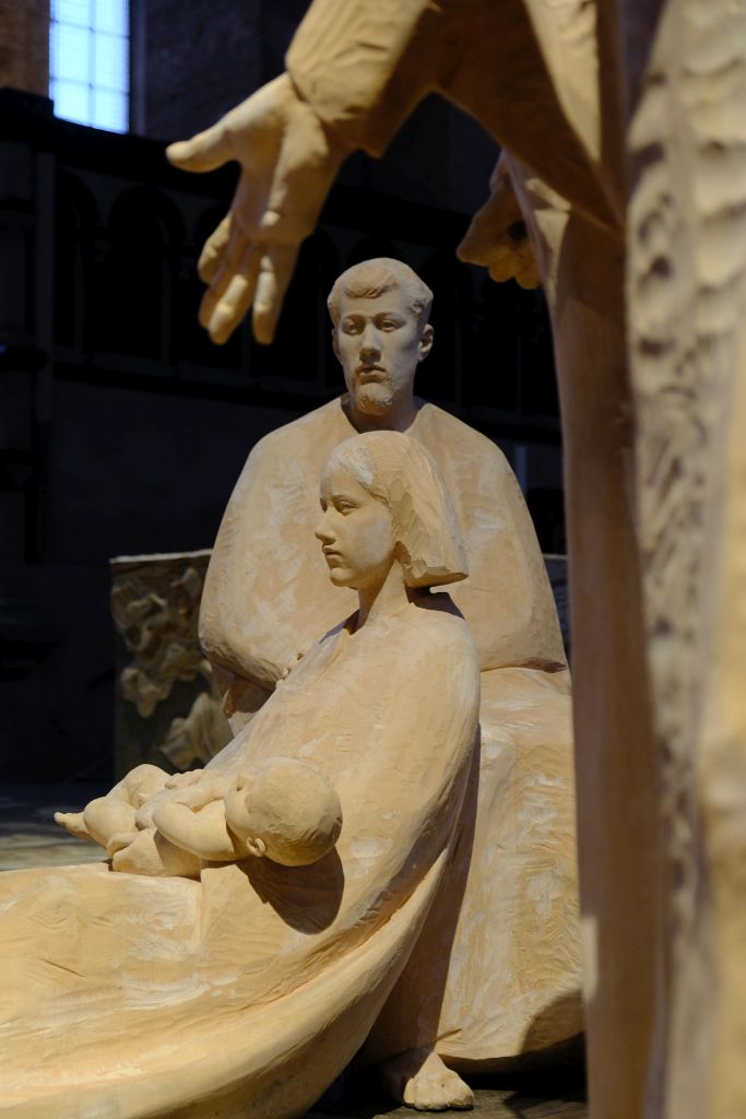 Anders als bei sonst üblichen Krippen ist die aus massivem Lindenholzgeschnitzte Figurengruppe im Altarraum platziert. Sie kondensiert sozusagen das Thema Grippe auf beeindruckende lebensgroße Figuren und rückt die weihnachtsbotschaft ins Zentrum der Lithurgie. Aus vier verschiedenen Entwürfen wählte eine Jury die Arbeit von Hubert Mussner aus Wolkenstein in Südtirol aus.