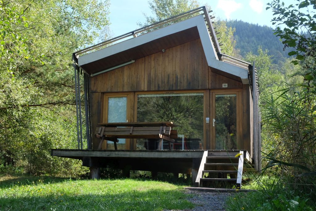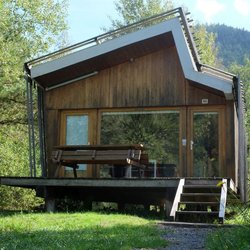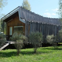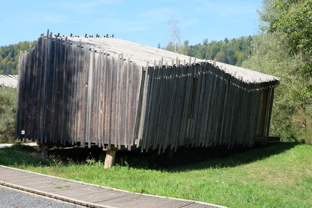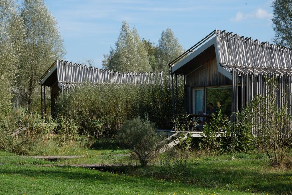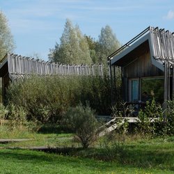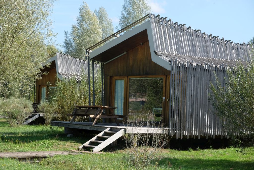 Am Lac de la Plaine gelegenes Feriendorf mit 20 Hauseinheiten und einem zentralen Empfangs- und Servicegebäude. Beim Bau wurde regionales Robinienholz eingesetzt.