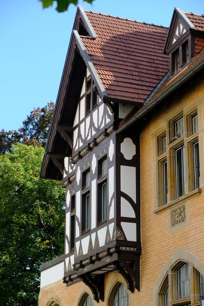 Fachwerkbau aus dem Jahre 1758, von 1921-23 Erweiterung mit Erker und Dachreiter