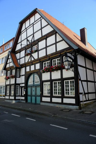 1580/90 entstandener Fachwerkbau. Die Balkenkopfschnitzereien am Übergang erstes/zweites Geschoß wurden später hinzugefügt (1890)