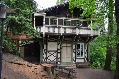 Achteckige Fachwerkbau aus dem Jahre 1867, ehemals Reithalle, heute gastronomisch genutzt.