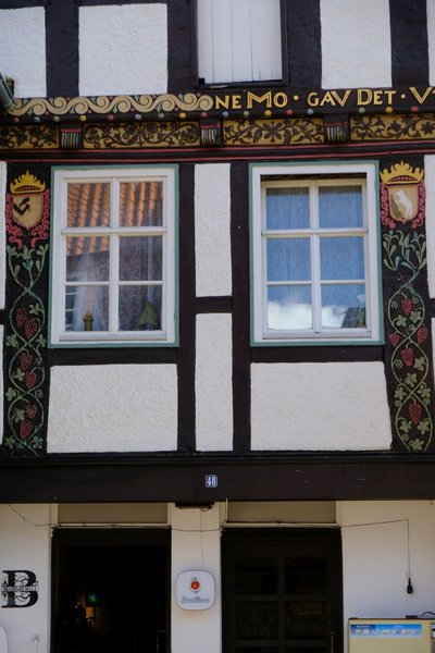 Erdgeschoß massiv, Obergeschoß aus Fachwerk. Das Haus stammt aus dem 16. Jahrhundert und war für Katholiken bestimmt, die sich nachts nicht in der evangelischen Stadt aufhalten durften.