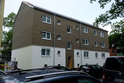 Drei ehemals dreigeschossige Wohnblocks wurden energetisch saniert (KfW-70) und um zwei weitere Geschosse in Holzrahmenbauweise aufgestockt.