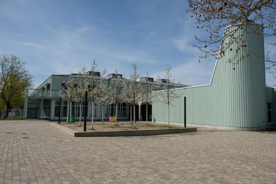Bei dem Stadtteilzentrum mit Schule, Sporthalle, Kindertagesstätte und Polizeistation handelt es sich um eine Beton-Skelett-Konstruktion mit Pfosten-Riegel-Fassaden aus Alu/Holz/Glaselementen.