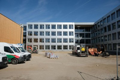 Die vorhandene Grundschule wurde um eine Mehrzweckhalle in Holzkonstruktion sowie um einen weiteren Klassentrakt in Mischbauweise erweitert. Letzterer besteht im Obergeschoss und in der Dachkonstruktion aus Holz.