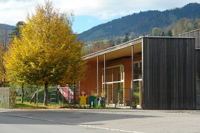 Kindergarten in Mischbauweise aus Beton und Holz mit einem Probenlokal für die örtlichen Musikvereine im Obergeschoss. Der betont helle Innenausbau setzte auf die Baumarten Birke und Weisstanne.