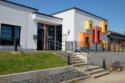 Zweigeschossige Kita, Erdgeschoss Massiv, Obergeschoss in Holzbauweise