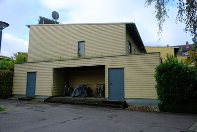 Prototyp eines Kompaktwohnhauses in Holzbauweise der Stiftung Nestwerk, das u.a. kurz laufende Erbbaurechte nutzen soll, um Nichtseßhaften eine Bleibe zu bieten. Bei Bedarf kann das Haus, das mit nur geringfügigen Eingriffen in das Gelände auskommt, jederzeit via Tieflader an einen neuen Standort verfrachtet werden.