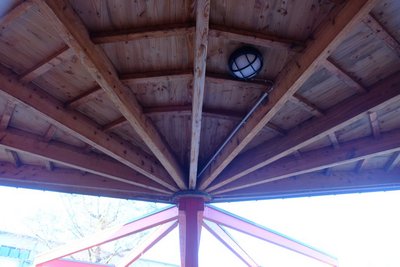 Aula, Turmhalle und überdachte Teile des Pausenhofes sind mit einer bis zu 30m überspannenden Konstruktion aus verleimten Hohlkastenträgern bedeckt. An der Unterseite sind diese mit Dreischichtplatten aus Douglasienholz verkleidet.